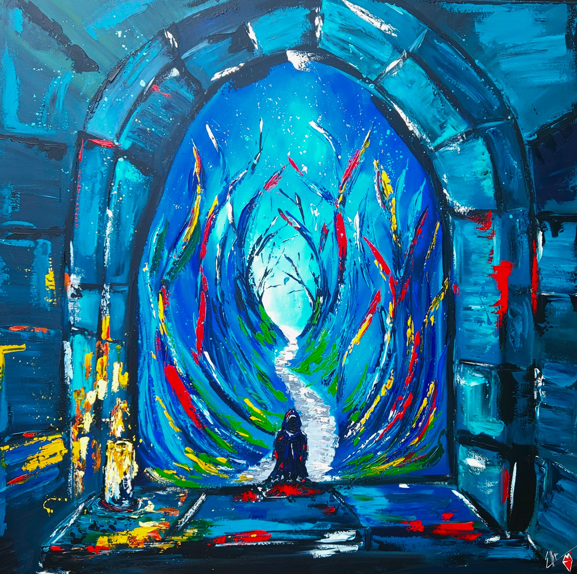 Za kamenným obloukem usedá postava do ticha, kde se stíny mění v hlasy. Šepoty se stáčejí jako větve, svíjejí se do tunelu barev a temnoty. Cesta vpřed je nejistá, ale někde v dálce, za vším tím šumem mysli, čeká světlo.