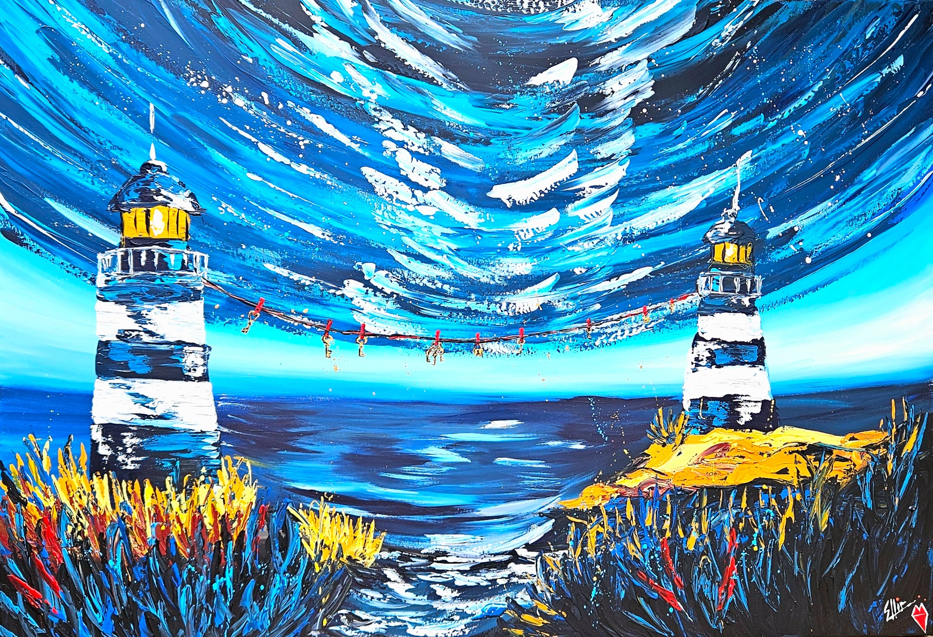 Na pobřeží stojí dva majáky, pevné jako sliby. Mezi nimi se vznáší nit, na níž visí svoboda i nevyřčená tajemství. Jejich světlo chrání, ale i mlčí a v tom tichu roste odvaha snít.